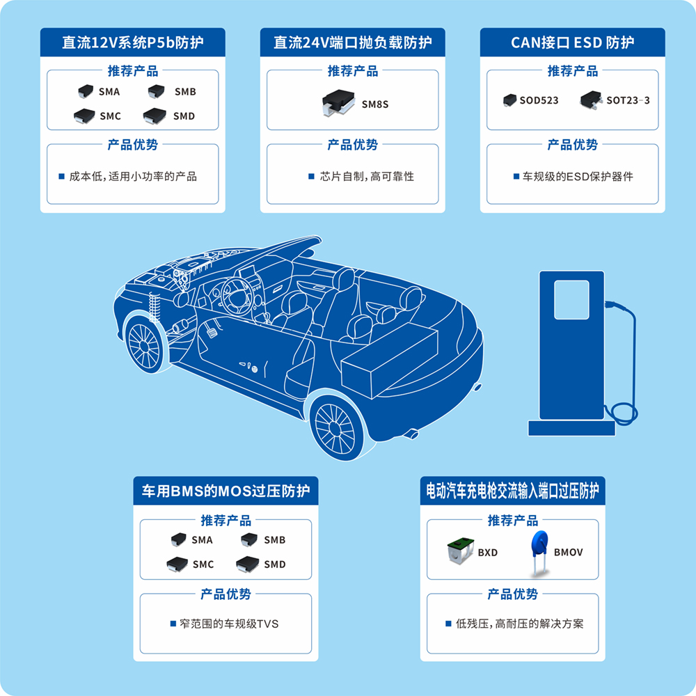 ▼看點二:汽車電子BMS、直流24V、直流12V、CAN接口、充電槍交流等防護解決方案