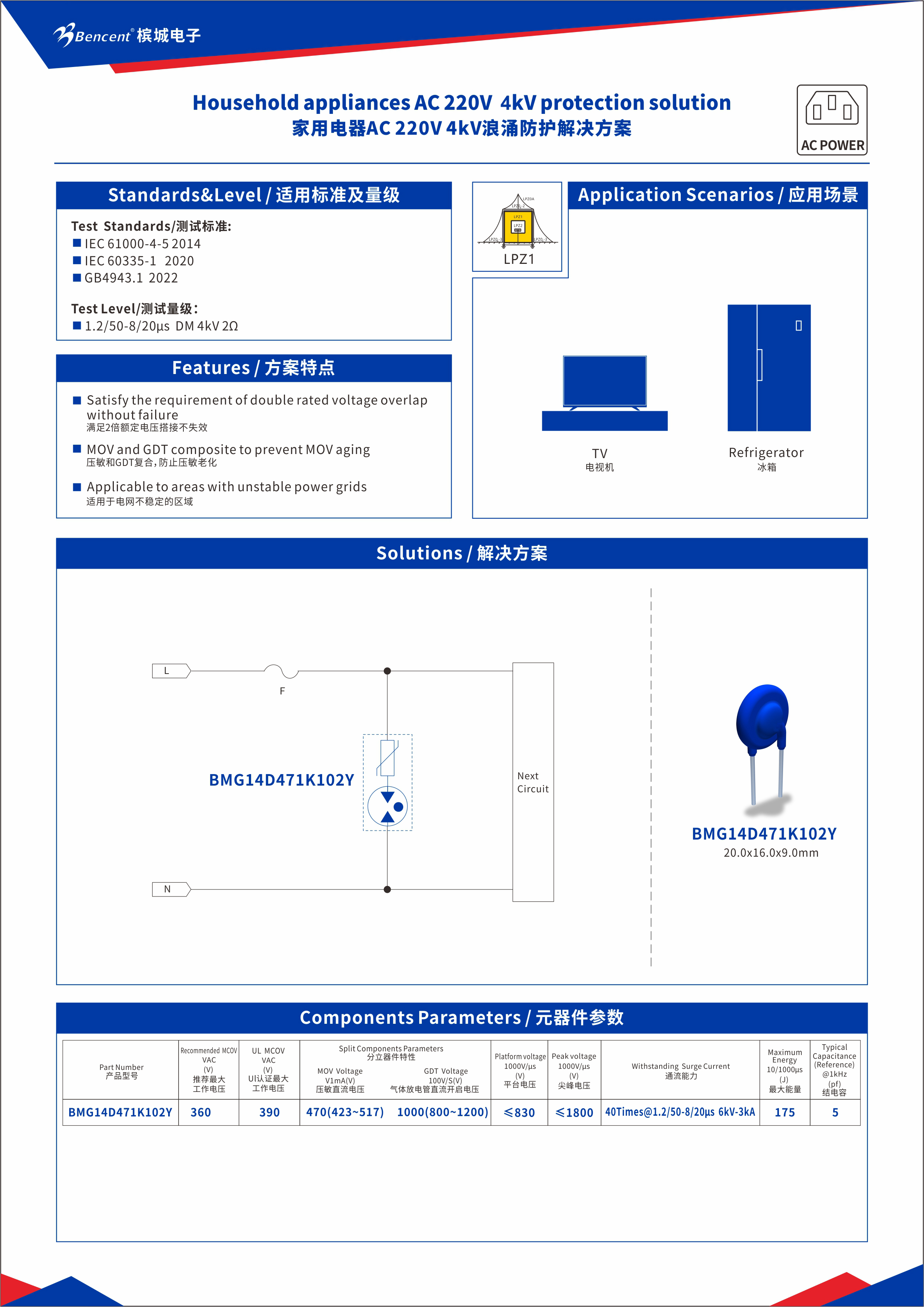 ? MOV復(fù)合GDT產(chǎn)品BMG系列——能夠有效調(diào)和新安規(guī)與浪涌保護(hù)之間的沖突,提供在同等Uc下,低箝位電壓的解決方案。