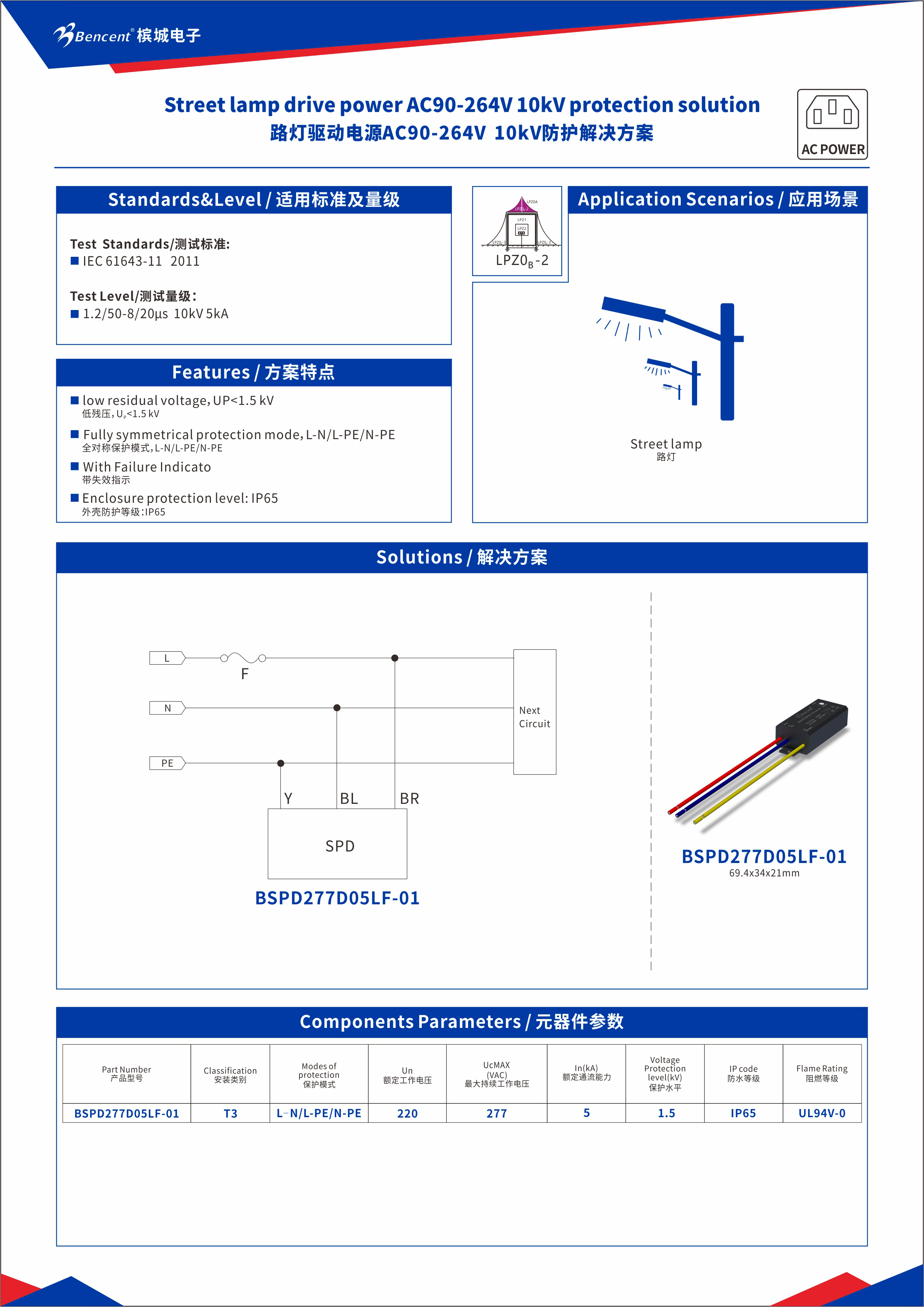 ? 外置式路燈驅(qū)動(dòng)電源防雷模塊BSPD277D05LF系列——提供高耐壓低殘壓的防雷SPD
